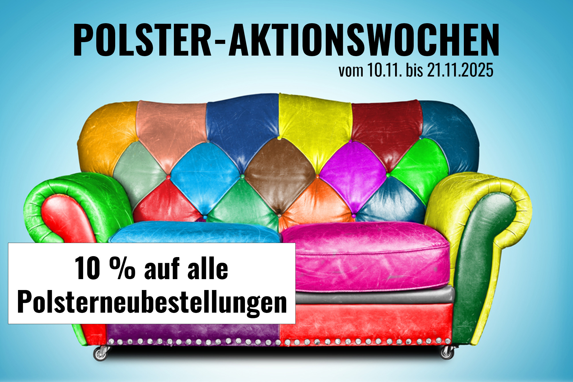 Während unserer Polster-Aktionswochen vom 10.11. bis 21.11.2025 erhalten Sie 10 % Rabatt auf alle Polsterneubestellungen – egal ob Sofa, Sessel oder Wohnlandschaft.