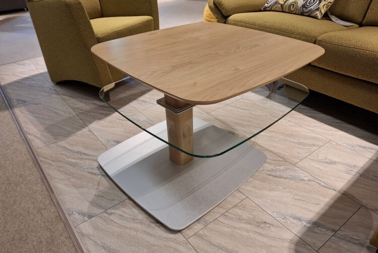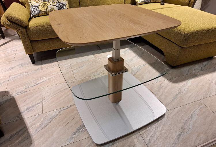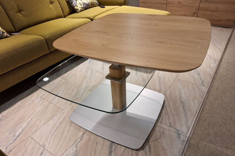 Dieser kompakte Couchtisch in Wildeiche verfügt über einen Hydro-Lift, eine drehbare Tischplatte und einen Ablageboden aus Klarglas. Damit passt er sich flexibel an unterschiedliche Sitzsituationen im Wohnzimmer an und fügt sich mit seiner klaren Linienführung in moderne Einrichtungen ein.