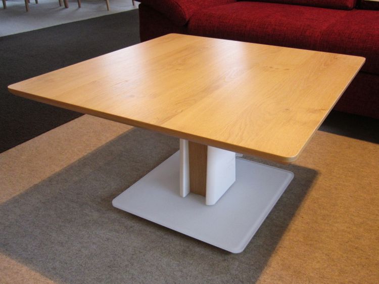 Dieser Couchtisch aus Wildeiche zeigt eine weiß abgesetzte Säule, der Fuß besteht aus Milchglas. Im Fußteil sind Rollen integriert, sodass Sie den Tisch bequem hin- und herschieben können. Die Kombination aus warmem Holz, weißer Säule und heller Milchglasbasis verleiht dem Tisch eine zurückhaltende, moderne Ausstrahlung.