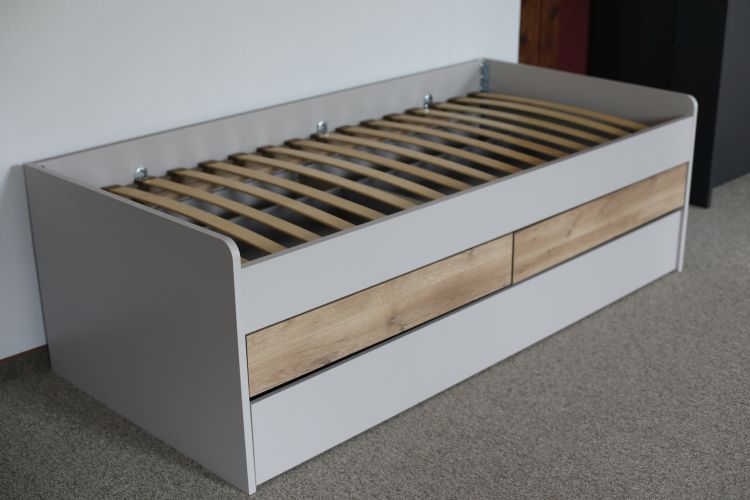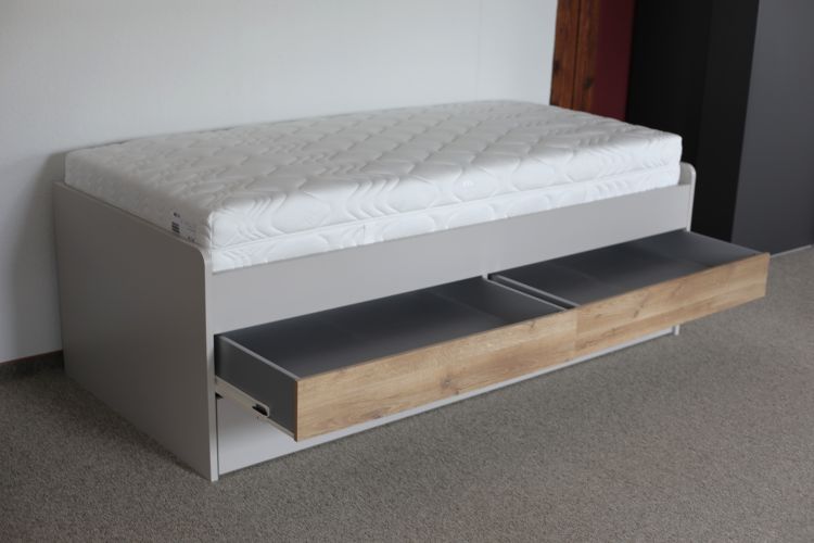 Die Duo-Liege „New York” in Risseiche Dekor und Sandgrau passt vor allem ins Jugend- oder Gästezimmer. Zwei mittige Schubkästen nehmen Bettwäsche und Kleinkram auf, darunter befindet sich ein Rollbettkasten, den Sie als Stauraum oder mit einer zusätzlichen Matratze als zweite Schlafgelegenheit nutzen können.