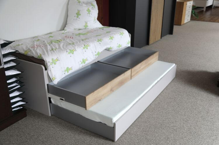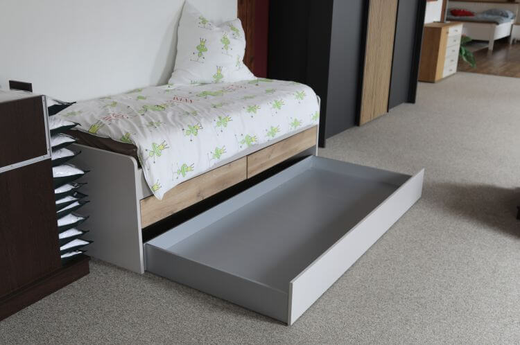 So haben Sie im Handumdrehen ein Bett für Übernachtungsgäste parat, ohne auf Stauraum zu verzichten. Die Matratzen sind im Preis nicht enthalten.
