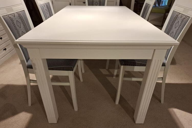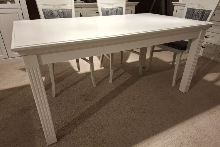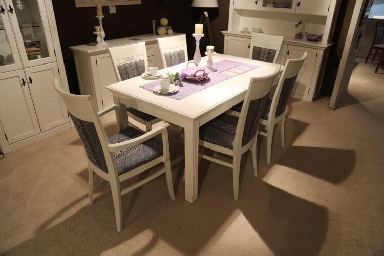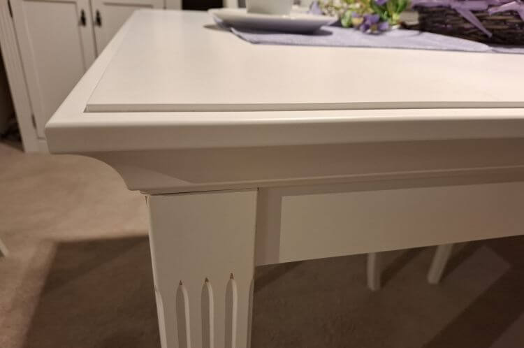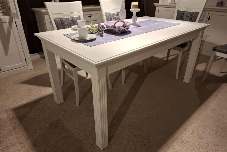 Der Esstisch Maisonette ist im Landhaus-Stil gefertigt und trägt eine weiße Vintage-Optik. Die kannelierten Pilaster an den Tischbeinen geben ihm seinen charakteristischen, ruhigen Ausdruck und setzen vor allem in offen gestalteten Wohn-Esszimmern einen schönen Akzent.