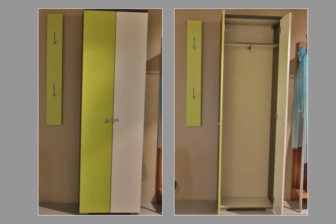 Die kompakte Garderobe Bastogne in Anthrazit, Weiß und Grün setzt sich aus einem schmalen Kleiderschrank und einem Wandpaneel mit zwei ausklappbaren Haken zusammen. Der Kleiderschrank nimmt Jacken auf einer Kleiderstange auf und bringt zusätzliches Fach für Mützen, Schals oder kleines Zubehör mit. Das Garderoben-Paneel ergänzt das Set an der Wand und schafft schnell erreichbare Ablagemöglichkeiten im Eingangsbereich.
