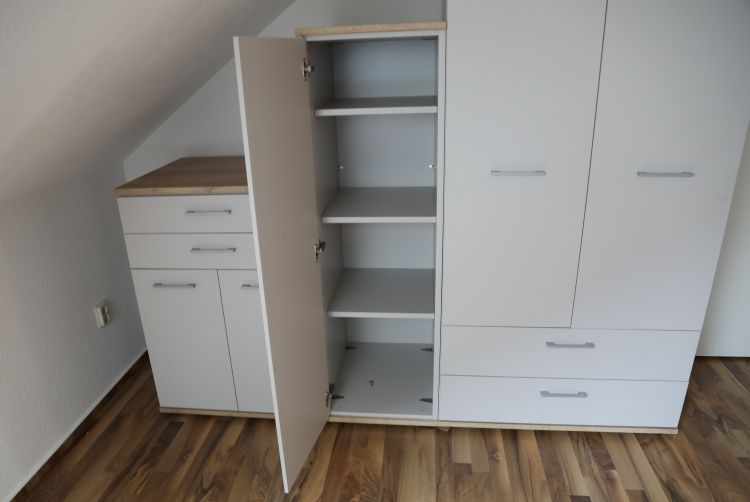 Dieses Jugendzimmer in Risseiche Nachbildung und Sandgrau setzt sich aus einer Jumbo-Kommode und zwei Drehtürenschränken zusammen. Die Jumbo-Kommode verfügt über zwei Türen und zwei Schubkästen und schafft Stauraum auf Greifhöhe. Der kleinere Drehtürenschrank ist mit Einlegeböden ausgestattet und eignet sich für Bücher, Wäsche oder Schulmaterial, der größere Drehtürenschrank bietet mit Kleiderstange und zwei zusätzlichen Schubkästen Platz für die komplette Garderobe.