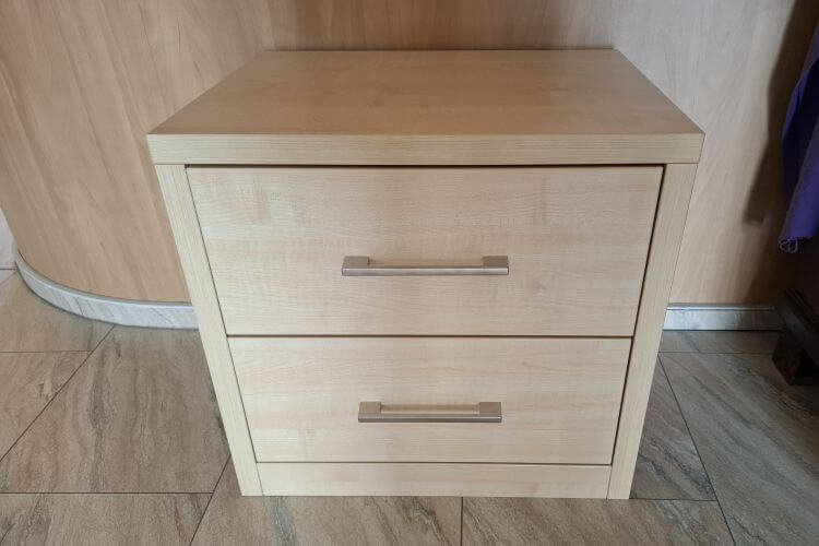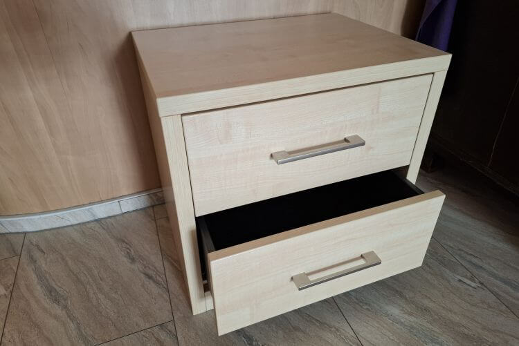 Das Nachttischelement „Multiflex – de Luxe” in Ahorn Nachbildung mit Griffen in Nickel matt hat 2 Schubkästen.