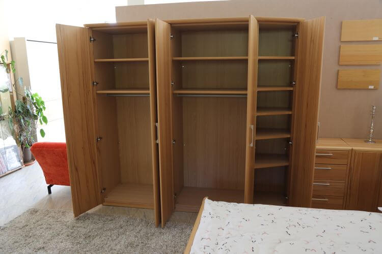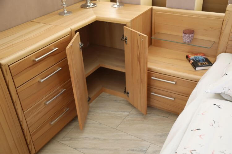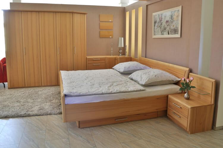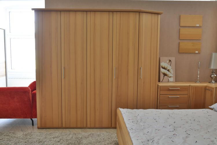 Das Schlafzimmer „Coretta” ist aus hochwertigem Kernbuche-Furnier gefertigt und verbindet eine natürliche Holzoptik mit durchdachten Funktionen. Zur Ausstattung gehören ein Kleiderschrank, eine Kommode, eine Eckkommode, zwei Nachtschränke und ein Doppelbett mit integriertem Bettkasten.