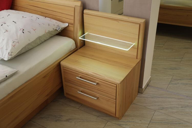 Die Eckkommode nutzt die Ecke des Raums platzsparend aus, die integrierte LED-Beleuchtung spendet am Abend ein dezentes Licht am Kopfteil und an den Ablagen.