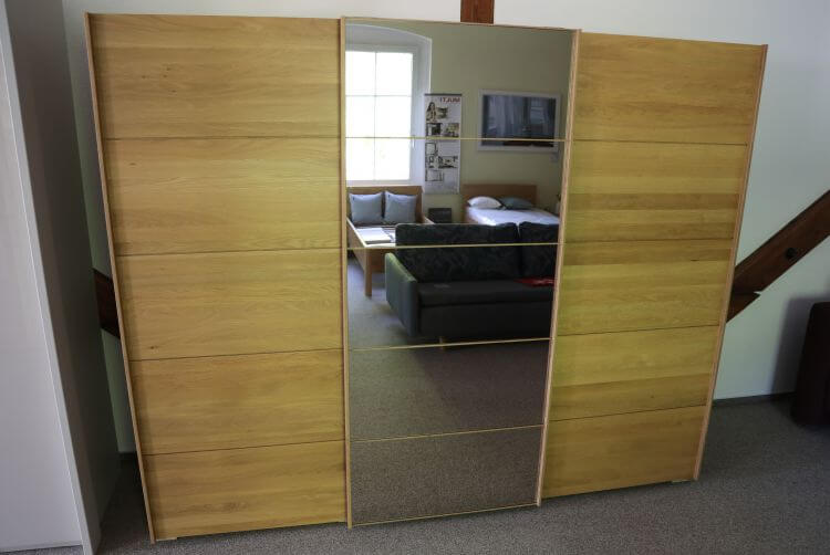 Der dreitürige, teilmassive Schwebetürenschrank „Lido” zeigt außen je eine Tür in Eiche und in der Mitte eine Spiegeltür. Die Türen sind jeweils in fünf Felder gegliedert und geben dem Schrank seinen ruhigen, klaren Charakter.