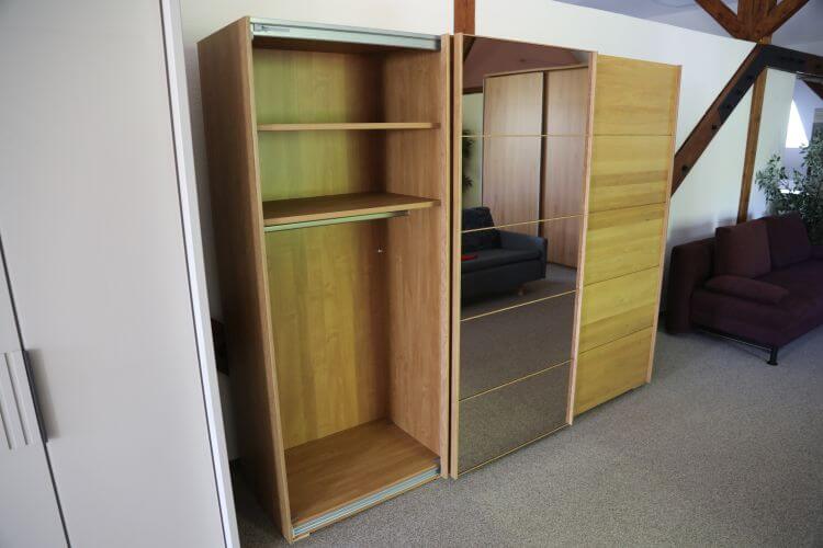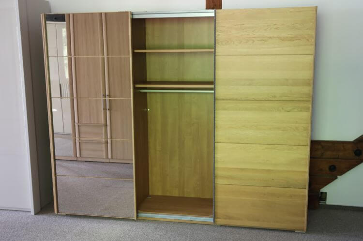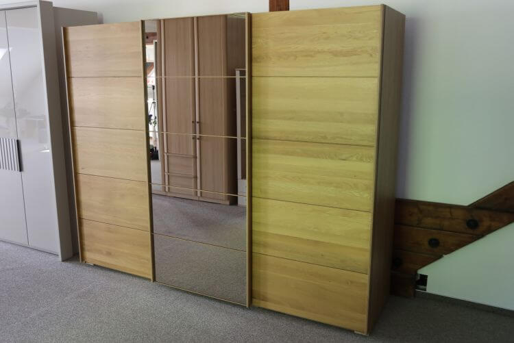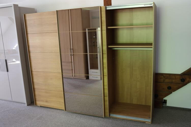 Im Inneren finden Sie sechs große Fachböden und drei Kleiderstangen, sodass Ihre Kleidung übersichtlich untergebracht ist. Vor allem die mittige Spiegeltür macht das Modell auch für kleinere Schlafzimmer praktisch. Schauen Sie sich dieses und weitere Modelle gern in unserer Ausstellung an.