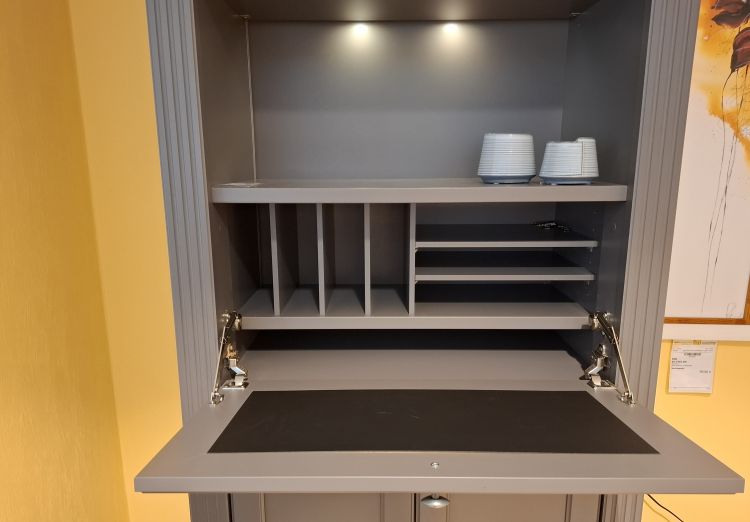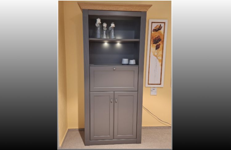 Das Regalelement hat 2 offene Fächer, ein Schreibfach und 2 Türen. Über dem Schreibfach befindet sich eine LED-Holzbodenbeleuchtung.
