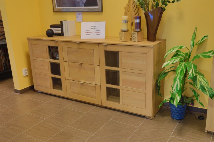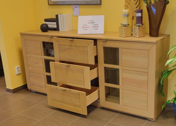 Sie suchen noch Massivholzmöbel für Ihr Esszimmer? Dann gefällt Ihnen vielleicht unser Sideboard in Natureiche bianco mit Schubkästen und Vitrinenelementen mit LED-Beleuchtung.