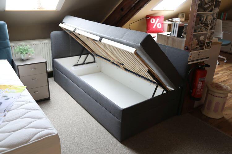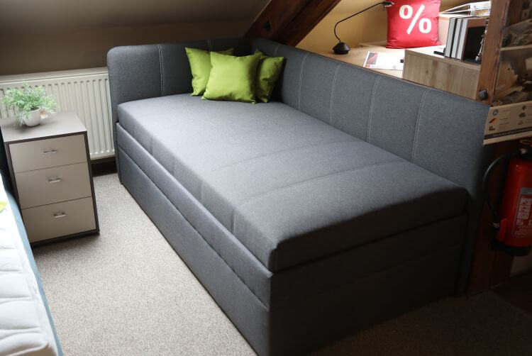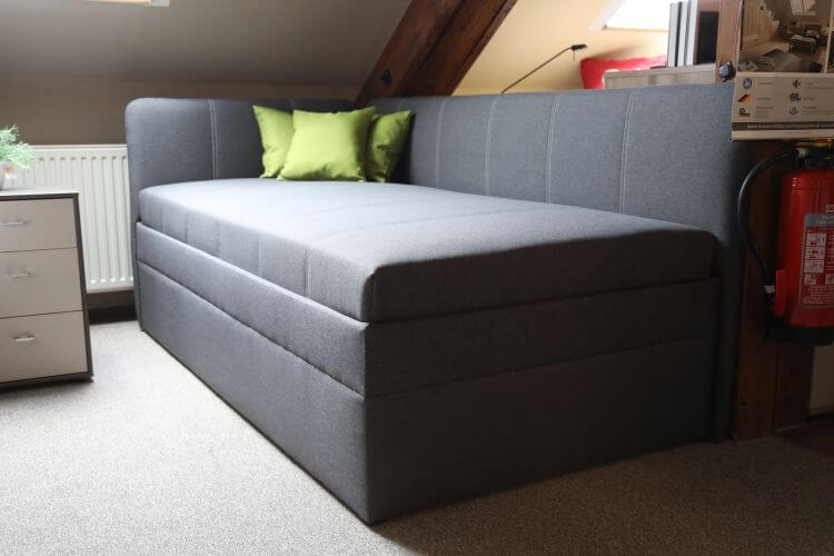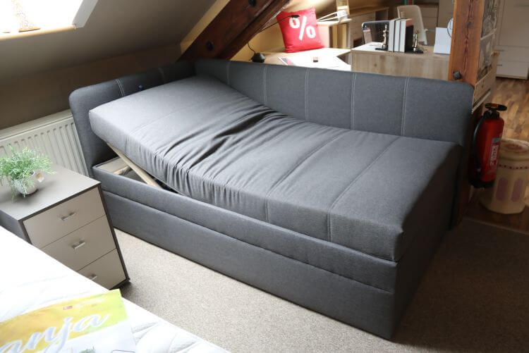 Die Umbauliege „Pia” mit Seitenteil links und Rückwand hat einen 7-Zonen-Tonnentaschenfederkern mit Härtegrad 3, einen großen Bettkasten und eine Kopfteilverstellung. Tagsüber dient sie als Sitzmöbel, nachts als Schlafplatz.