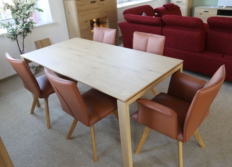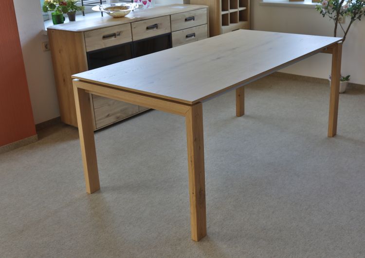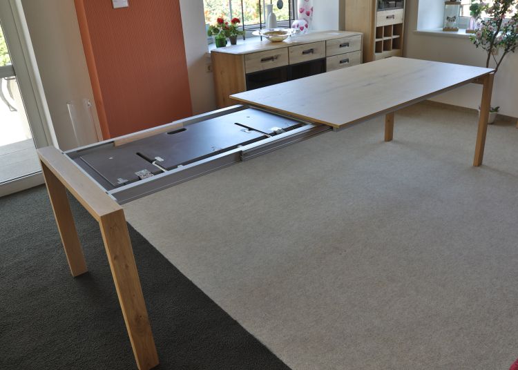 Der Vierfußtisch LS 705118 der Firma Klose in Natureiche bianco bringt eine Frontslide-Auszugsfunktion mit Klappeinlage mit. Die Tischplatte lässt sich von 175 cm auf 275 cm erweitern, sodass Sie im Alltag einen kompakten Esstisch haben und bei größeren Runden ohne lose Einlegeplatten einfach verlängern.