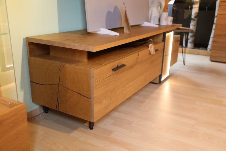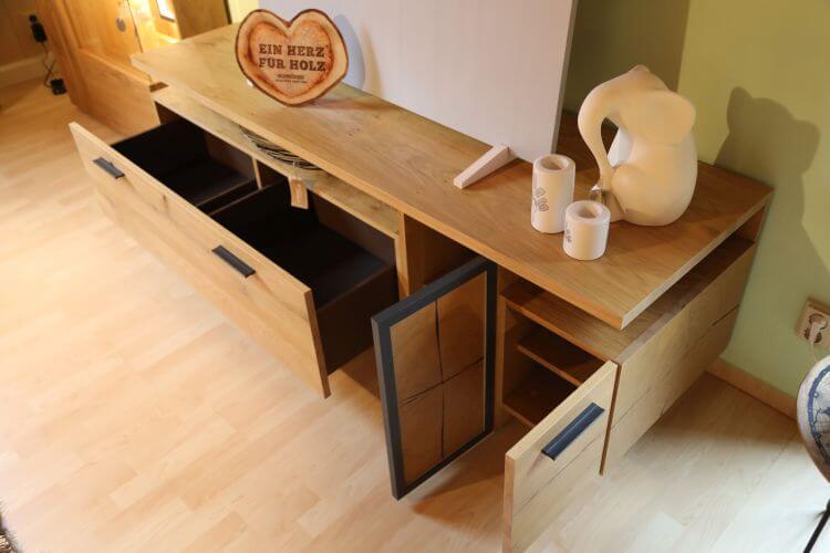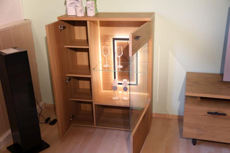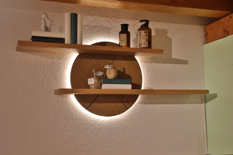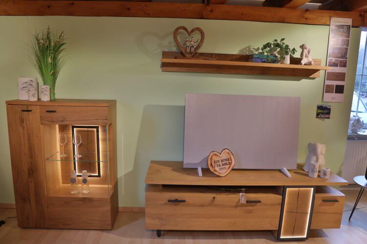 Die Wohnwand besteht aus einem Standelement mit Vitrine, einem TV-Unterteil und einem Wandboard. Das Wandboard „Baumscheibe” erhalten Sie auch einzeln. Die Beleuchtung ist im Preis enthalten.