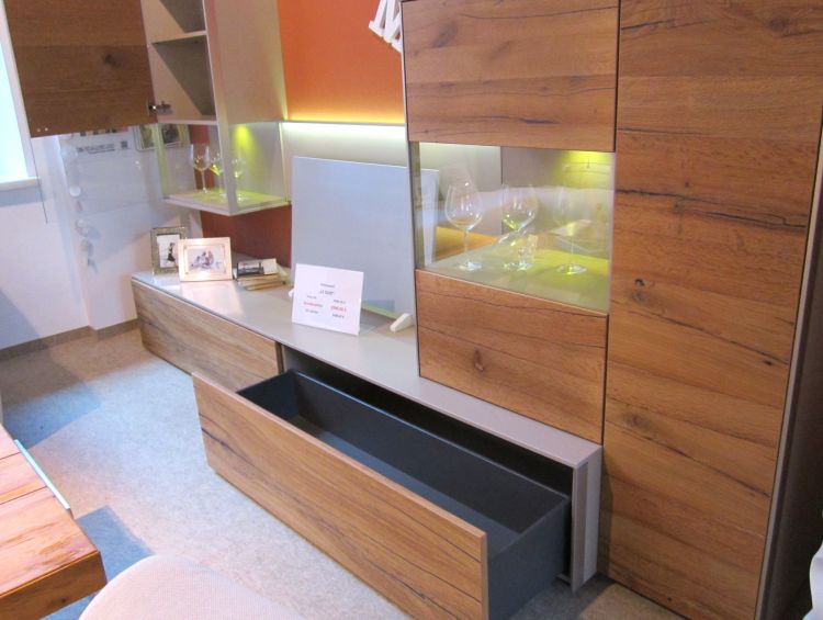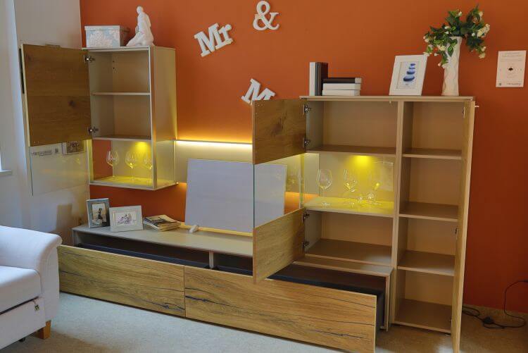 Edle Wohnwand aus Anziano Eiche und Lack sand matt, mit Beleuchtung und Paneel-Rückwand.
