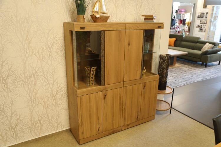 Besondere Highlights setzen die Rückwände in Balkaneiche vintage grau und die Blenden der Vitrinentüren in Waldkanten-Akzent. Die Beleuchtung ist im Preis enthalten.